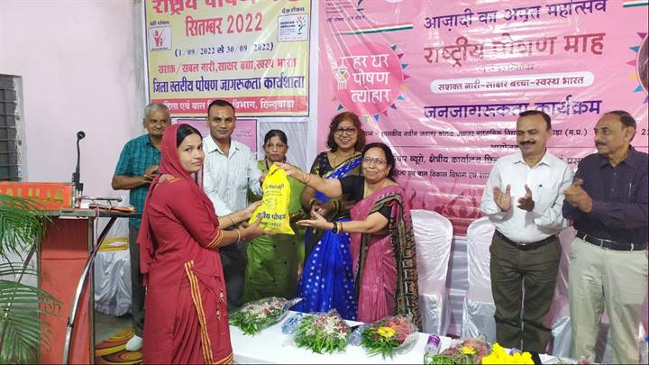 भारत सरकार के सूचना एवं प्रसारण मंत्रालय के केन्द्रीय संचार ब्यूरो के क्षेत्रीय कार्यालय के तत्वावधान में महिला एवं बाल विकास विभाग के सहयोग से राष्ट्रीय पोषण माह 2022 पर आज छिंदवाड़ा नगर में मटन मार्केट के पास स्थित शासकीय नवीन जवाहर बालक उच्चतर माध्यमिक विद्यालय में एक विशेष जनजागरूकता कार्यक्रम संपन्न हुआ । इस कार्यक्रम के अंतर्गत संवाद कार्यक्रम, प्रश्न मंच, रंगोली, चित्रकला आदि प्रतियोगिताओं के साथ ही पोषण आहार संबंधी प्रदर्शनी व चलित प्रदर्शनी का शुभारंभ भी किया गया ।