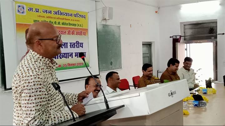 मध्यप्रदेश जन अभियान परिषद छिंदवाड़ा के जिला समन्वयक पवन सहगल ने बताया कि कार्यक्रम में मुख्य अतिथि एवं प्राचार्य डॉ.पांडे ने कहा कि एकात्मवाद व मानवतावाद के प्रणेता पंडित दीनदयाल उपाध्याय के जन्म दिवस पर हम संकल्प लें कि हम सभी समाजसेवी अंतिम पंक्ति के जरूरतमंद लोगों की मदद के लिए अंत्योदयवाद को सार्थक करें । कार्यक्रम अध्यक्ष रामसहाय प्रजापति ने कहा कि आज देश की आजादी के 75 वर्ष पूर्ण होने के उपलक्ष्य में शासन द्वारा आजादी के अमृत महोत्सव के अंतर्गत गुमनाम स्वतंत्रता संग्राम सेनानियों को याद किया जा रहा है । इसी उपलक्ष्य में आज पंडित दीनदयाल उपाध्याय की जयंती भी मनाई जा रही है । पंडित उपाध्याय ने दो मुख्य विचारधारायें एकात्म मानववाद और अंत्योदय देश को दिया । म.प्र.जन अभियान परिषद के जिला समन्वयक श्री सहगल ने कहा कि बीएसडब्ल्यू व एमएसडब्ल्यू के पाठ्यक्रम में पंडित दीनदयाल उपाध्याय के एकात्मवाद व मानवतावाद की विचारधारा को शामिल किया गया है जिससे विद्यार्थी सभी समाजसेवी कार्यों को और अच्छे ढंग से पूरी लगन और ईमानदारी से करते हुये जरूरतमंद लोगों की मदद कर सकें। प्रमुख वक्ता अंशुल शुक्ला ने कहा कि पंडित दीनदयाल उपाध्याय का लक्ष्य मानव सेवा ही माधव सेवा है और इसी उद्देश्य से उन्होंने अंतिम छोर के व्यक्ति तक मदद पहुंचाने की बात कही। दंत रोग चिकित्सक डॉ.हितेश मिश्रा ने पंडित दीनदयाल उपाध्याय की राष्ट्रवाद, संस्कृतिवाद व भक्तिवाद के दर्शन पर अपने विचार व्यक्त किए। वक्ता श्री परेश वर्मा ने पंडित दीनदयाल की ऐतिहासिक पृष्ठभूमि पर अपने विचार रखते हुए युवाओं को उनके द्वारा समाज हित में किए गए कार्यों को बताया और राष्ट्र निर्माण में युवाओं की महत्वपूर्ण भूमिका बताते हुए उन्हें कार्य करने के प्रति प्रेरित किया। उन्होंने पंडित दीनदयाल उपाध्याय के छिंदवाड़ा आगमन की विस्तृत जानकारी सभी से साझा की और पंडित दीनदयाल उपाध्याय से प्रेरित होकर अपने पिताजी के विस्तारक के रूप में लाहौर में दी गई सेवाओं व अन्य स्थानों पर प्रचारक के रूप में दी गई सेवाओं के संबंध में विस्तार से बताया।