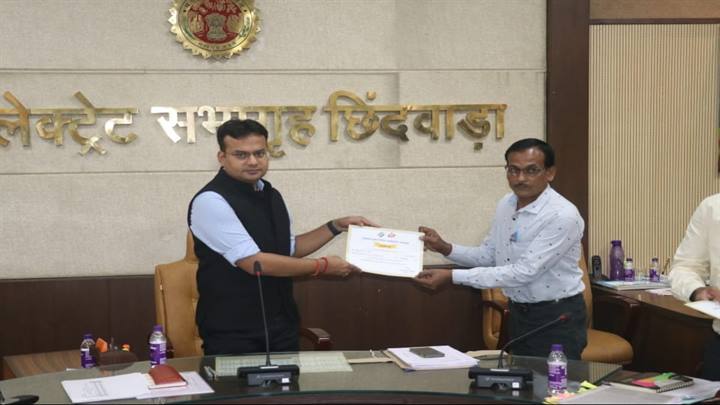 कलेक्टर एवं जिला निर्वाचन अधिकारी श्री सुमन द्वारा समय सीमा की बैठक में विधानसभा क्षेत्र क्रमांक-122 जुन्नारदेव के मतदान केन्द्र क्रमांक-15 कपूरनाला के बी.एल.ओ. नंदराम यादव व मतदान केन्द्र क्रमांक-151 दमुआ के बी.एल.ओ. मनोज सिसोदिया, विधानसभा क्षेत्र क्रमांक-123 अमरवाड़ा के मतदान केन्द्र क्रमांक-7 खडुआ के बी.एल.ओ. विजय कुमार साहू व मतदान केन्द्र क्रमांक-209 लछुआ के बी.एल.ओ. त्रिवेन्द्र चंद्रवंशी, विधानसभा क्षेत्र क्रमांक-124 चौरई के मतदान केन्द्र क्रमांक-38 हतोड़ा के बी.एल.ओ. बसंत वर्मा व मतदान केन्द्र क्रमांक-161 परसगांबसर्रा के बी.एल.ओ. मनीष कुमार सोलंकी, विधानसभा क्षेत्र क्रमांक-125 सौंसर के मतदान केन्द्र क्रमांक-3 चारगांव करबल के बी.एल.ओ. रामकृष्ण पवार व मतदान केन्द्र क्रमांक-224 लोधीखेड़ा की बी.एल.ओ. रंजना सिन्द्रे, विधानसभा क्षेत्र क्रमांक-126 छिंदवाड़ा के मतदान केन्द्र क्रमांक-131 भूला के बी.एल.ओ. नितिन कुमार ठाकुर व मतदान केन्द्र क्रमांक-152 नवेगांव के बी.एल.ओ. पुरूषोत्तम शेंडे, विधानसभा क्षेत्र क्रमांक-127 परासिया के मतदान केन्द्र क्रमांक-112 खिरसाडोह की बी.एल.ओ. रजनी पाल व मतदान केन्द्र क्रमांक-134 डोंगर परासिया के बी.एल.ओ. मोहन प्रसाद नागवंशी और विधानसभा क्षेत्र क्रमांक-128 पांढुर्णा के मतदान केन्द्र क्रमांक-76 सिंगपुर के बी.एल.ओ. विनोद पाटिल व मतदान केन्द्र क्रमांक-147 भुआरी के बी.एल.ओ. सुखदेव जाबड़े को प्रशंसा पत्र प्रदाय किये गये ।
