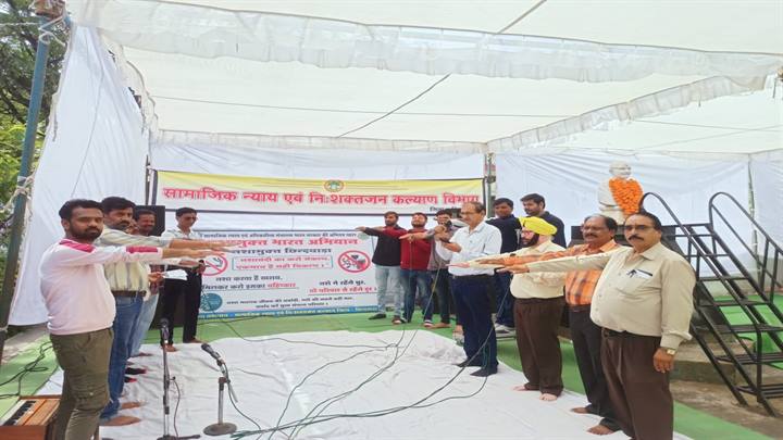 सामाजिक न्याय एवं नि:शक्तजन कल्याण विभाग द्वारा गांधी जयंती के उपलक्ष्य में आज जिला पंचायत परिसर में महात्मा गांधी की प्रतिमा पर तिलक लगाकर व सूत की माला पहनाकर नशा मुक्ति अभियान का शुभारंभ किया गया। कार्यक्रम में उप संचालक सामाजिक न्याय एवं नि:शक्तजन कल्याण एस.के. गुप्ता ने सभी को नशामुक्ति की शपथ दिलाई । जिले में यह नशामुक्ति कार्यक्रम आगामी 30 नवंबर तक चलेगा ।