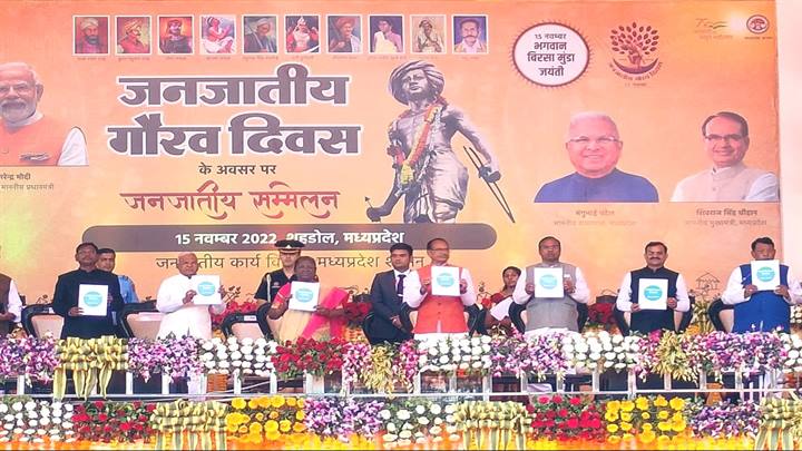 राष्ट्रपति श्रीमती मुर्मु ने कहा कि आज मध्यप्रदेश में जनजातीय वर्गों के कल्याण के लिये जिन प्रकल्पों को प्रारंभ किया गया है, वे सभी राष्ट्रीय महत्व के हैं। अनुसूचित क्षेत्रों के लिये बनाए गए नये नियम जनजातीय क्षेत्रों के सशक्तिकरण एवं जनजातीय वर्ग को उनके अधिकार दिलाने में प्रभावी होंगे। सम्पूर्ण स्वास्थ्य कार्यक्रम, मेधावी विद्यार्थियों का सम्मान, बिरसा मुण्डा स्व-रोजगार योजना, टंट्या मामा आर्थिक कल्याण योजना, महिला उद्यमियों का सम्मान सभी जनजातीय सशक्तिकरण में अत्यंत उपयोगी सिद्ध होंगे। राष्ट्रपति श्रीमती द्रोपदी मुर्मु आज लालपुर, शहडोल में राज्य स्तरीय जनजातीय गौरव दिवस सम्मेलन को संबोधित कर रही थीं। राष्ट्रपति ने मध्यप्रदेश के सम्पूर्ण स्वास्थ्य कार्यक्रम योजना पुस्तिका का विमोचन किया। राज्यपाल श्री मंगुभाई पटेल ने राष्ट्रपति श्रीमती मुर्मु को पेसा अधिनियम नियमावली की प्रथम प्रति सौंपी। राष्ट्रपति श्रीमती मुर्मु ने सर्वप्रथम भगवान बिरसा मुण्डा के चित्र पर पुष्पाजंलि अर्पित की। राज्यपाल श्री पटेल ने राष्ट्रपति श्रीमती मुर्मु का वीरन माला, जनजातीय दुपट्टा पहना कर स्वागत किया। मुख्यमंत्री श्री चौहान ने राष्ट्रपति श्रीमती मुर्मु का जनजातीय पगड़ी पहना कर स्वागत किया और उन्हें भील पिथोरा चित्र कलाकृति भेंट की।