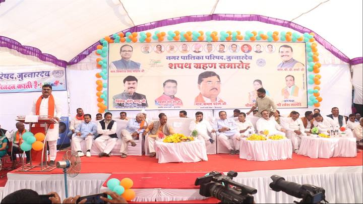प्रदेश के किसान कल्याण तथा कृषि विकास और छिन्दवाड़ा जिले के प्रभारी मंत्री श्री कमल पटेल आज जुन्नारदेव पहुंचे और नगर पालिका परिषद के शपथ ग्रहण समारोह में शामिल हुये । इस दौरान उन्होंने नवनिर्वाचित पार्षदों और अध्यक्ष व उपाध्यक्ष को बधाई और शुभकामनाएं दीं एवं नागरिकों के हित में पूरी ईमानदारी और निष्ठा से कार्य करने का आह्वान किया। इस अवसर पर जिला आपदा प्रबंधन समिति के सदस्य श्री विवेक साहू, पूर्व मंत्री चौधरी चंद्रभान सिंह, पूर्व विधायक सर्वश्री पं.रमेश दुबे, ताराचंद बावरिया व नत्थन शाह कवरेती, सर्वश्री शेषराव यादव, नवनीत मोनू जैन, विजय पांडे, संतोष पारेक, कमलेश उइके व टीकाराम चंद्रवंशी सहित अन्य जनप्रतिनिधि, गणमान्य नागरिक, नगर पालिका परिषद के अधिकारी कर्मचारी और बड़ी संख्या आमजन उपस्थित थे।