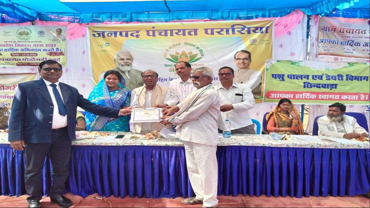 मुख्यमंत्री पशुपालन विकास योजना के अंतर्गत गत दिनों भारतीय उन्नत नस्ल की दुधारू गायों की जिला स्तरीय पुरस्कार प्रतियोगिता संपन्न हुई। इस प्रतियोगिता में जिले के विकासखंड परासिया के ग्राम सिरगोरा के श्री कल्याण यदुवंशी को 51000 रूपये का प्रथम, छिंदवाड़ा नगर के श्री रामगोपाल चौरिया को 21000 रूपये का व्दितीय और विकासखंड परासिया के ग्राम बीजागोरा के श्री ललित सूर्यवंशी को 11000 रूपये का तृतीय पुरूस्कार प्राप्त किया । उप संचालक पशुपालन एवं डेयरी विभाग डॉ.एच.जी.एस.पक्षवार ने बताया कि विकास यात्रा के दौरान गत दिनों ग्राम मोरडोंगरीखुर्द में जनप्रतिनिधियों और अतिथियों द्वारा विजेता पशुपालकों को प्रमाण पत्र देकर सम्मानित किया गया । इस अवसर पर विभागीय सहायक संचालक डॉ.एम.के.मौर्य, डॉ.रविंद्र नागले, डॉ.राजेश चेडगे, श्री आर.एन.धारपुरे व श्री विजेंद्र वर्मा सहित ग्रामीण जन उपस्थित थे।