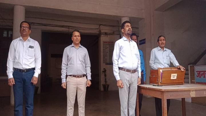 माह के प्रथम कार्य दिवस पर आज राष्ट्र-गान एवं राष्ट्र-गीत के गायन के बाद कार्यालयीन गतिविधियां प्रारंभ हुईं। कलेक्ट्रेट प्रांगण में अतिरिक्त कलेक्टर श्री ओ.पी.सनोडिया और संयुक्त कलेक्टर श्री अजीत तिर्की के साथ ही विभिन्न विभागों के अधिकारियों व कर्मचारियों ने शासकीय कला पथक दल के साथ राष्ट्र-गान 'जन गण मन' एवं राष्ट्र-गीत 'वंदे मातरम्' का सामूहिक गायन किया।