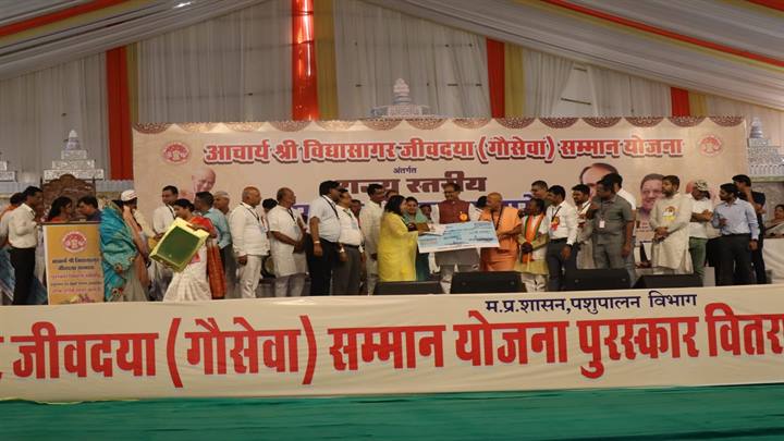 प्रदेश के मुख्यमंत्री श्री शिवराज सिंह चौहान आज अमरकंटक में आचार्य श्री विद्यासागर जीव दया पुरस्कार समारोह में शामिल हुये और उन्होंने प्रदेश की श्रेष्ठ गौ-शालाओं, गौ-भक्तों और पशु सेवकों को पुरस्कार वितरित किये । इसी तारतम्य में म.प्र. गौ-संवर्ध्दन बोर्ड भोपाल द्वारा राज्य शासन के आचार्य श्री विद्यासागर जीव दया (गौ-सेवा) सम्मान योजना के अंतर्गत वर्ष 2021-22 के लिये संस्थागत श्रेणी में चयनित छिन्दवाड़ा जिले के ग्राम तिवड़ाकामथ (बांडाबोह) की संस्था श्री मातृ कृपा गौ-शाला को भी 50 हजार रूपये की राशि का चैक प्रदान कर सम्मानित किया गया । उल्लेखनीय है कि कलेक्टर श्रीमती शीतला पटले और मुख्य कार्यपालन अधिकारी जिला पंचायत श्री पार्थ जैसवाल के मार्गदर्शन में जिले में मुख्यमंत्री गौ-सेवा योजना के अंतर्गत ग्राम बांडाबोह में श्री मातृ कृपा गौ-शाला संचालित है । इस गौ-शाला में उपलब्ध गौ-वंश, निर्मित शेड, गोबर से खाद निर्माण, गोबर गैस प्लांट आदि के लिये म.प्र. गौ-संवर्ध्दन बोर्ड भोपाल द्वारा इस संस्था को यह पुरूस्कार दिया गया है । इस गौ-शाला के संचालन में जिला प्रबंधक नाबार्ड श्रीमती श्वेता सिंह, गौ-शाला के नोडल अधिकारी डॉ.जितेन्द्र बघेल व सहायक नोडल अधिकारी श्री आर.पी.देशमुख का विशेष सहयोग रहा है ।