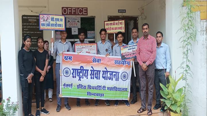 इंदिरा प्रियदर्शनी महाविद्यालय छिंदवाड़ा की राष्ट्रीय सेवा योजना इकाई द्वारा नशा निवारण दिवस पर जागरूकता कार्यक्रम संपन्न हुआ । कार्यक्रम में राष्ट्रीय सेवा योजना के कार्यक्रम अधिकारी श्री रितेश मालवीय ने नशे के दुष्परिणाम से विद्यार्थियों को अवगत कराया और तंबाकू से होने वाले कैंसर जैसे भयानक रोग से लड़ने के लिए समाज को तम्बाकू से दूर रहने के लिए प्रेरित किया । इस अवसर पर सामाजिक न्याय एवं दिव्यांगजन सशक्तिकरण विभाग के वरिष्ठ कलाकार श्री नरेंद्र पाल की उपस्थिति में सभी विद्यार्थियों को नशे से दूरी बनाए रखने की शपथ भी दिलाई गई।